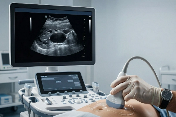 Plný močový měchýř: Před vyšetřením nemočte.